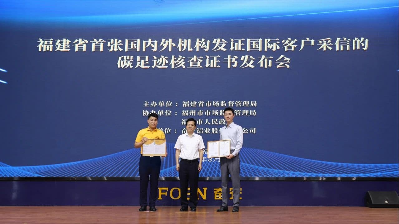 Pada tanggal 19 Agustus, sertifikat verifikasi jejak karbon pertama di Provinsi Fujian, yang diterbitkan oleh lembaga sertifikasi domestik dan asing serta diakui oleh klien internasional, resmi dianugerahkan di FOEN Aluminum Co., Ltd. Para pemimpin yang hadir dalam upacara tersebut antara lain Huang Shuimu, Sekretaris Kelompok Pimpinan Partai dan Direktur Administrasi Regulasi Pasar Provinsi Fujian; Chen Zongsheng, Sekretaris Kelompok Pimpinan Partai dan Direktur Administrasi Regulasi Pasar Fuzhou; Lin Hezhi, Wakil Wali Kota Fuqing. Turut hadir pula Huang Fen, Ketua FOEN Aluminum Co., Ltd., beserta personel terkait dari departemen regulasi pasar provinsi dan Institut Metrologi Provinsi Fujian, perwakilan dari China Quality Mark Certification Group dan Intertek Testing Services (Shanghai) Co., Ltd.