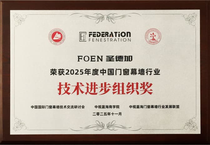 Penghargaan "Technological Progress Organization Award" merupakan pengakuan tingkat tinggi atas upaya FOEN Shengdejia dalam inovasi teknologi dan pengembangan sistem Litbangnya. Penghargaan ini mengapresiasi kinerja luar biasa perusahaan dalam riset dan pengembangan teknologi jendela dan dinding tirai, inovasi proses, serta transformasi hasil riset menjadi aplikasi praktis, yang menunjukkan kekuatan FOEN Shengdejia yang luar biasa.